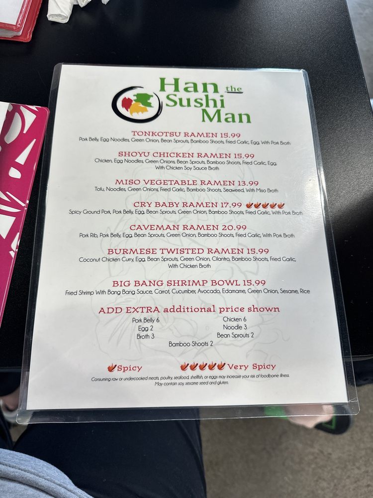 While some may find the prices slightly high for lunch, the quality of the food and the expanded menu make it worth it. If you're in the mood for top-notch sushi, sashimi, and ramen dishes, Han the Sushi Man is the place to be. Don't miss out on trying the new noodle bowls for a flavorful and satisfying meal.
